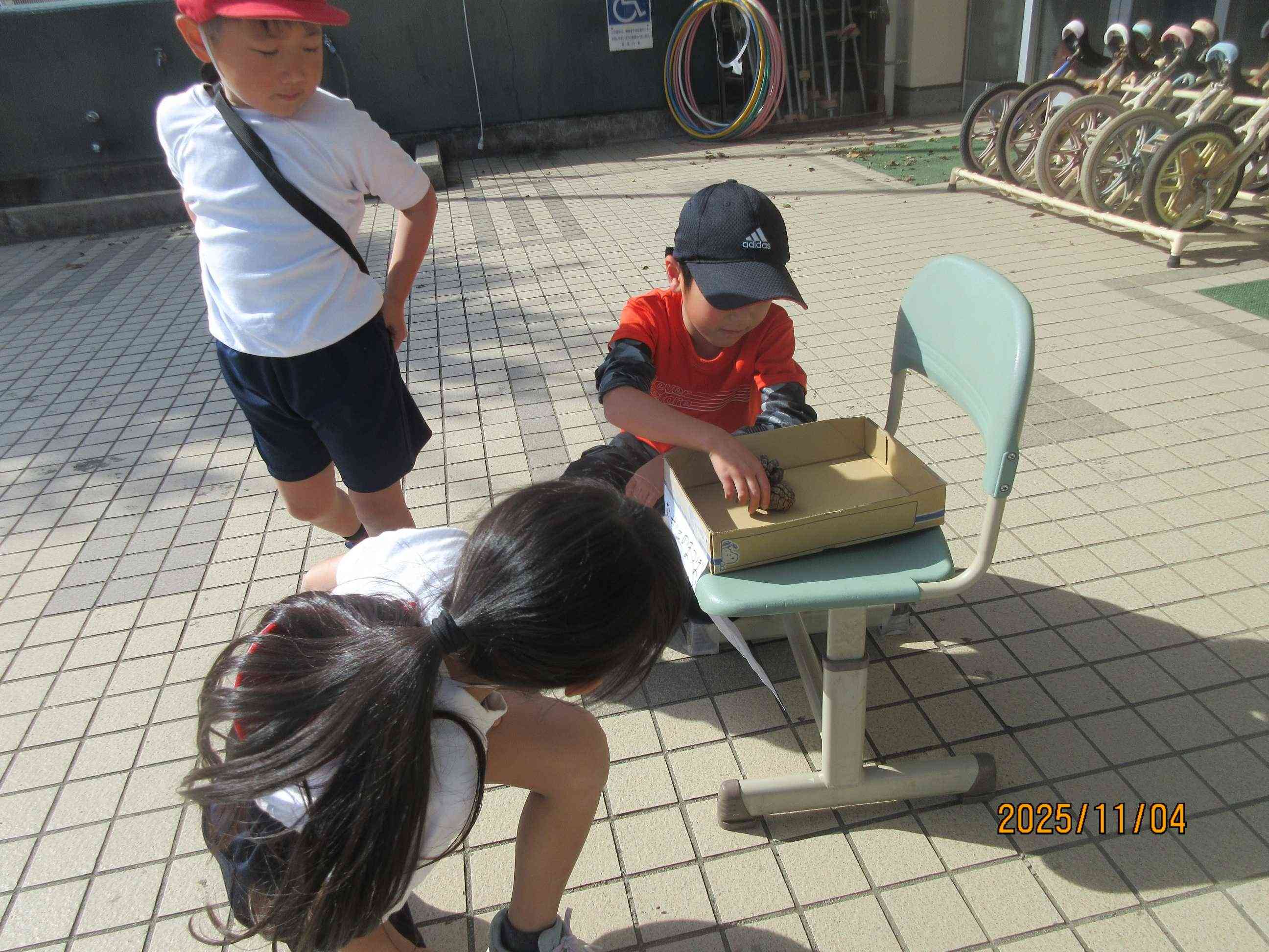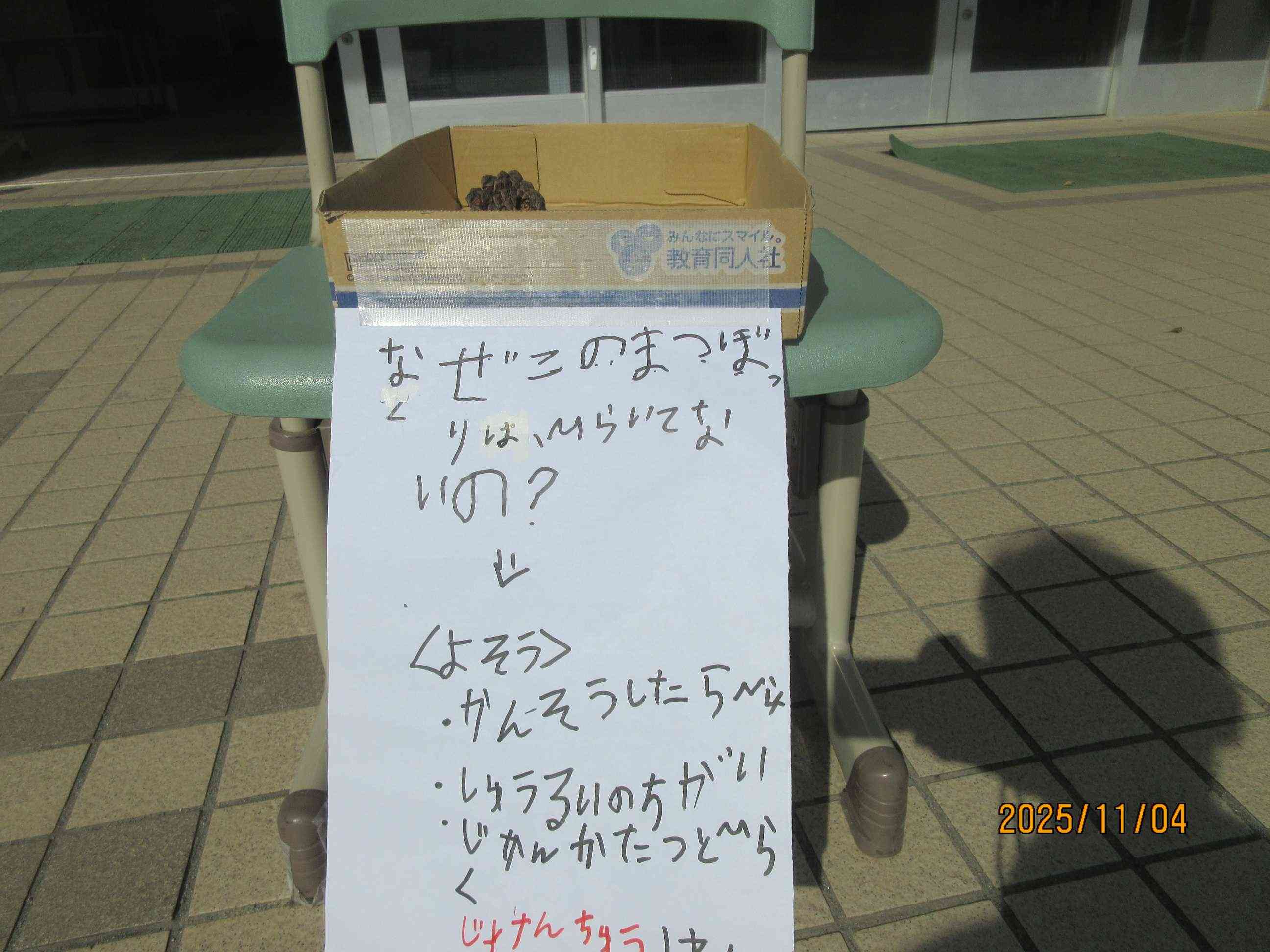 内郷小の昇降口の前に何やら椅子がぽつんと置かれていました。よく見ると、1年生が何か実験をしているようです。生活科で拾ってきた松ぼっくりを見比べると、開いている松ぼっくりと閉じている松ぼっくりがあるようです。なぜだろう?という好奇心が確かめてみようという気持ちに変わったみたいです。貼ってある紙を読むと、彼らなりの仮説ができていました。理科的な思考の始まりです。