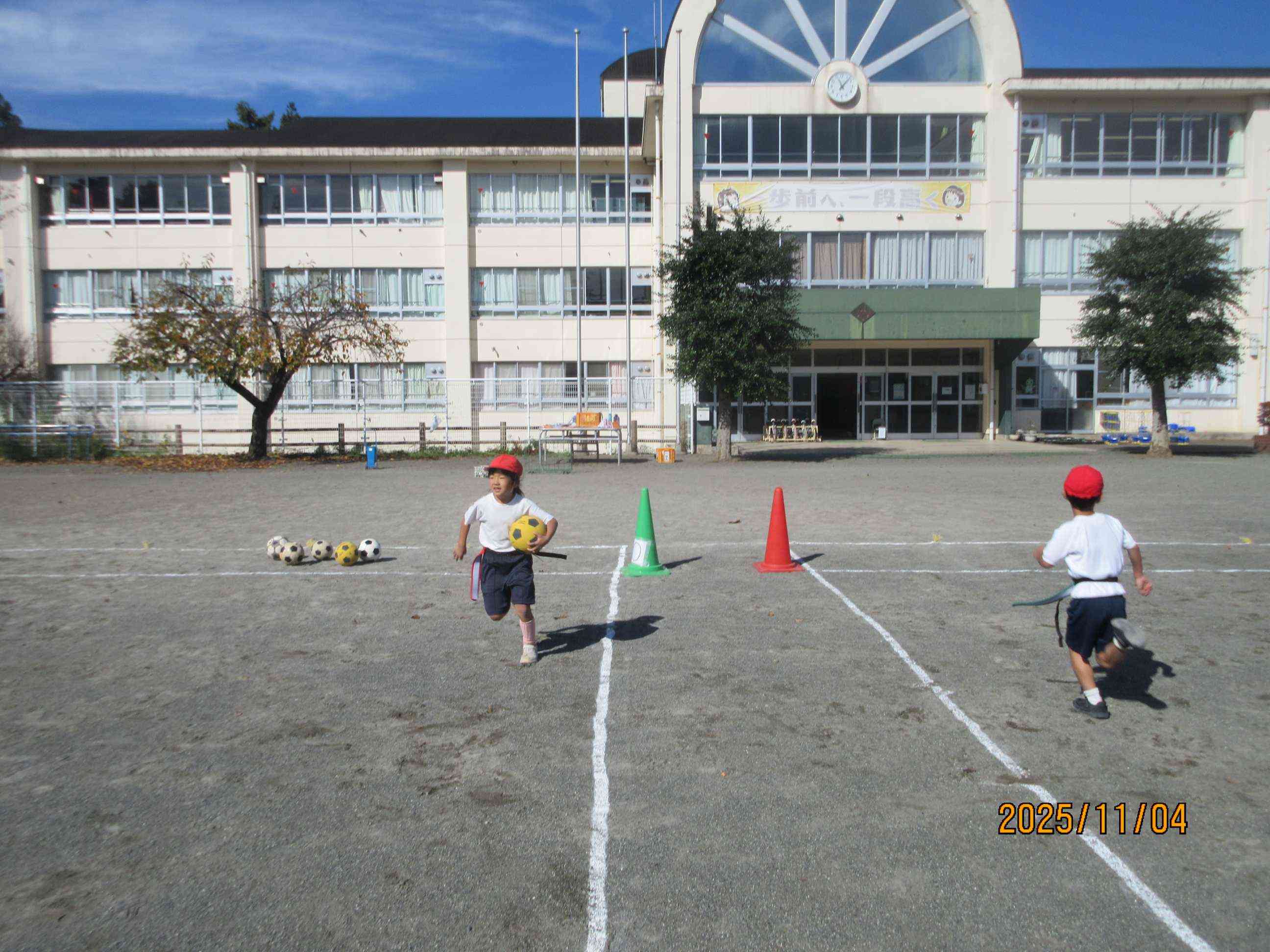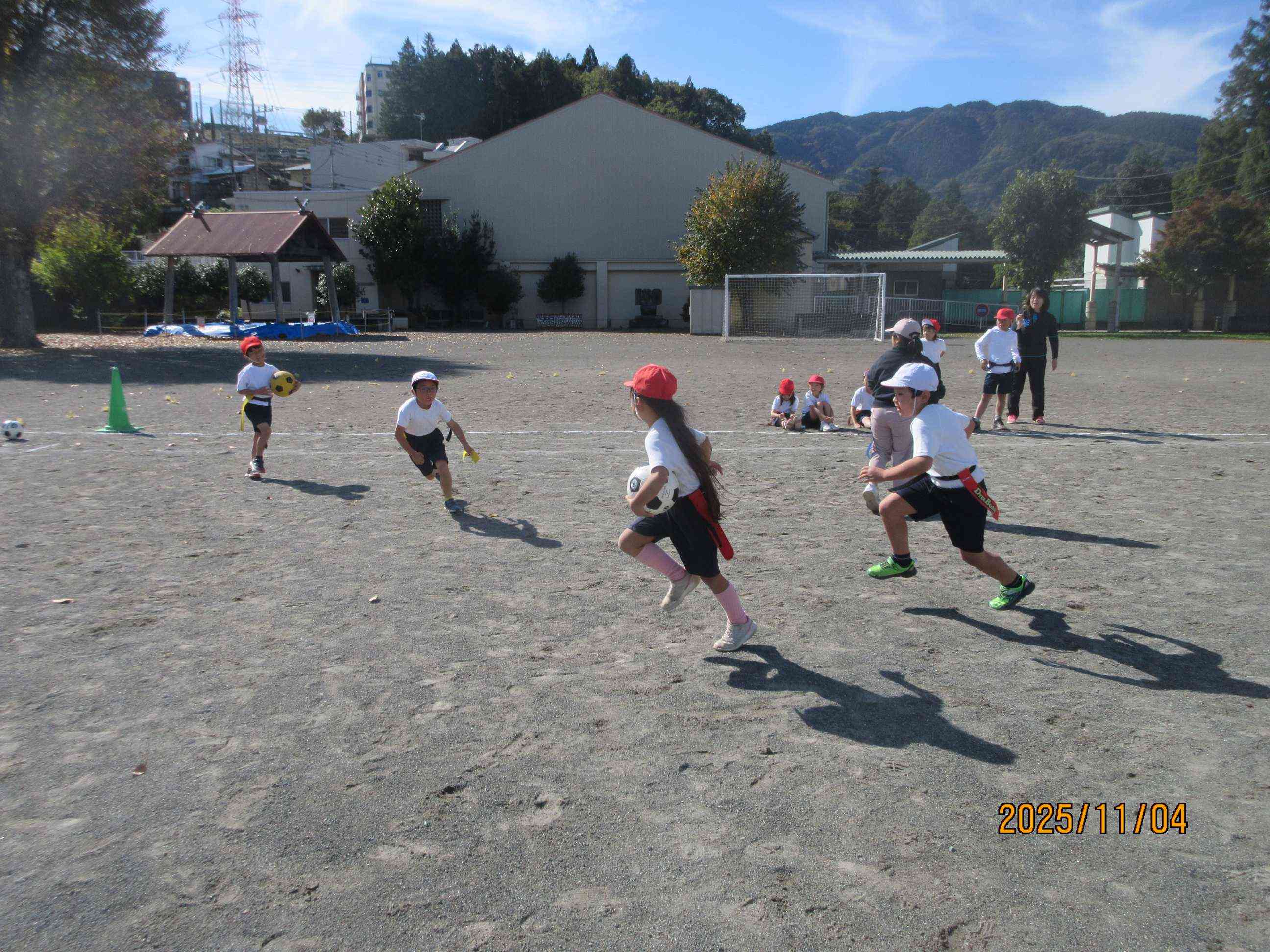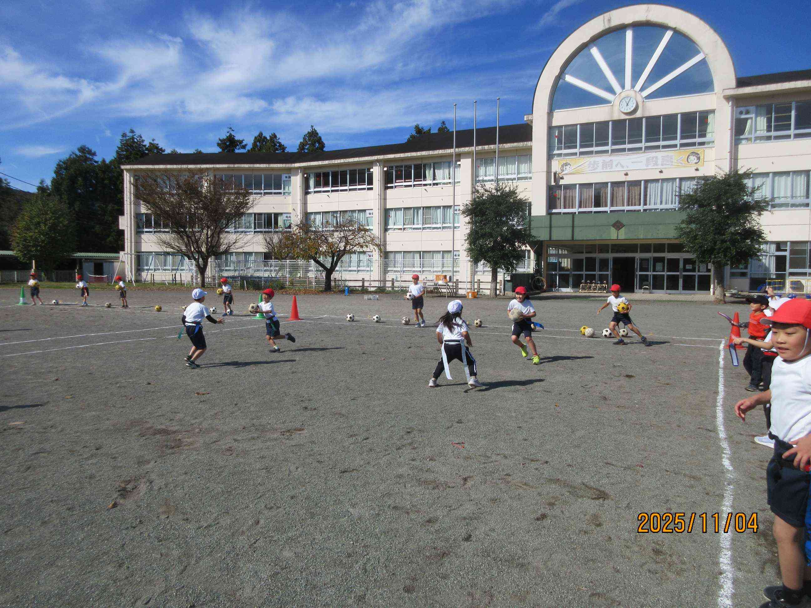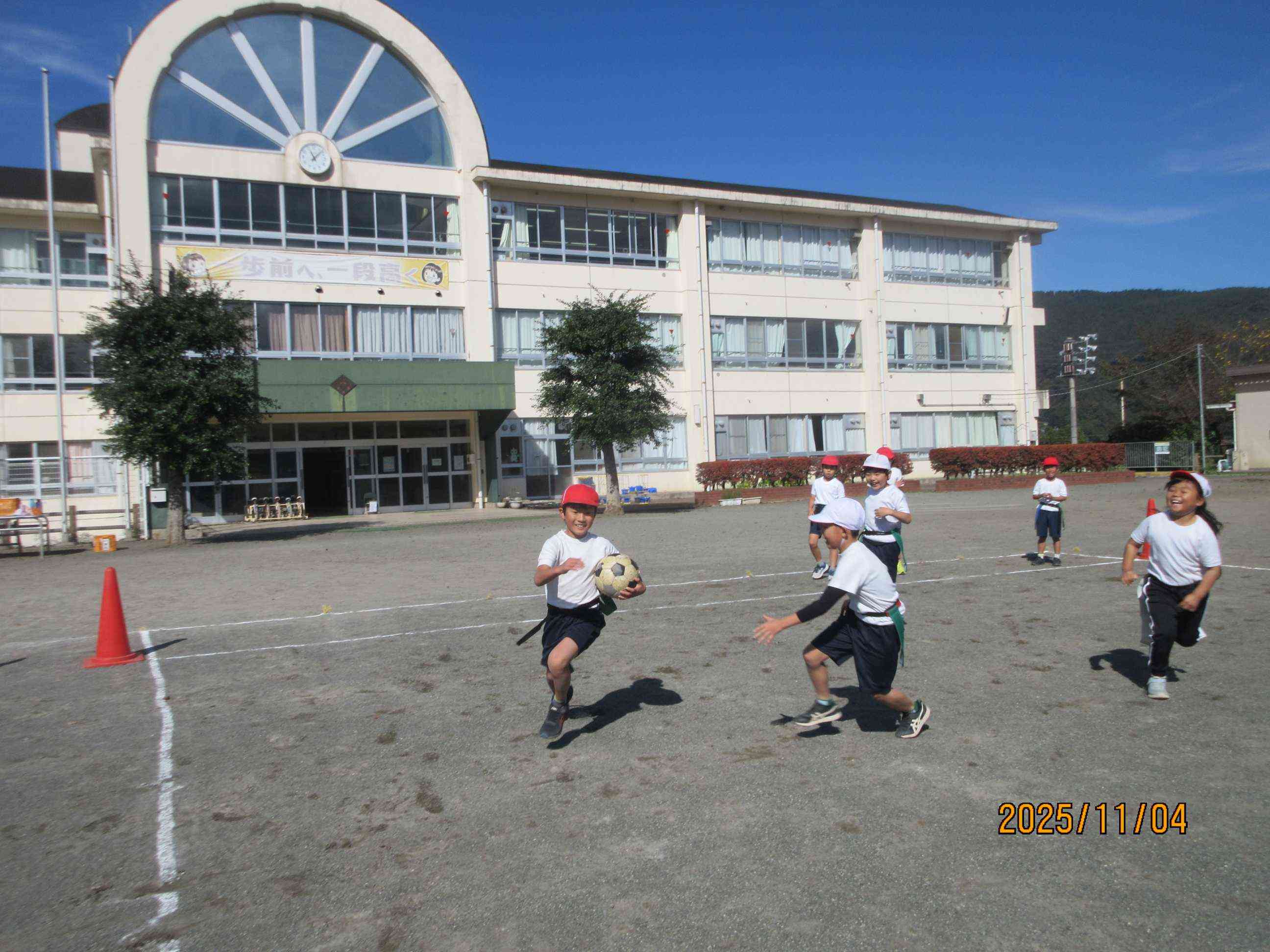 青空のもと、グランドでは1・2年生が体育の学習をしています。ボールを持って、腰につけているタグを取られず運ぶゲームみたいです。子ども達の動きを見ていると、ラグビーのような動きをしていました。どこに走れば抜けるか、フェイントをどのようにかけるか、考え・判断しながら走っています。
