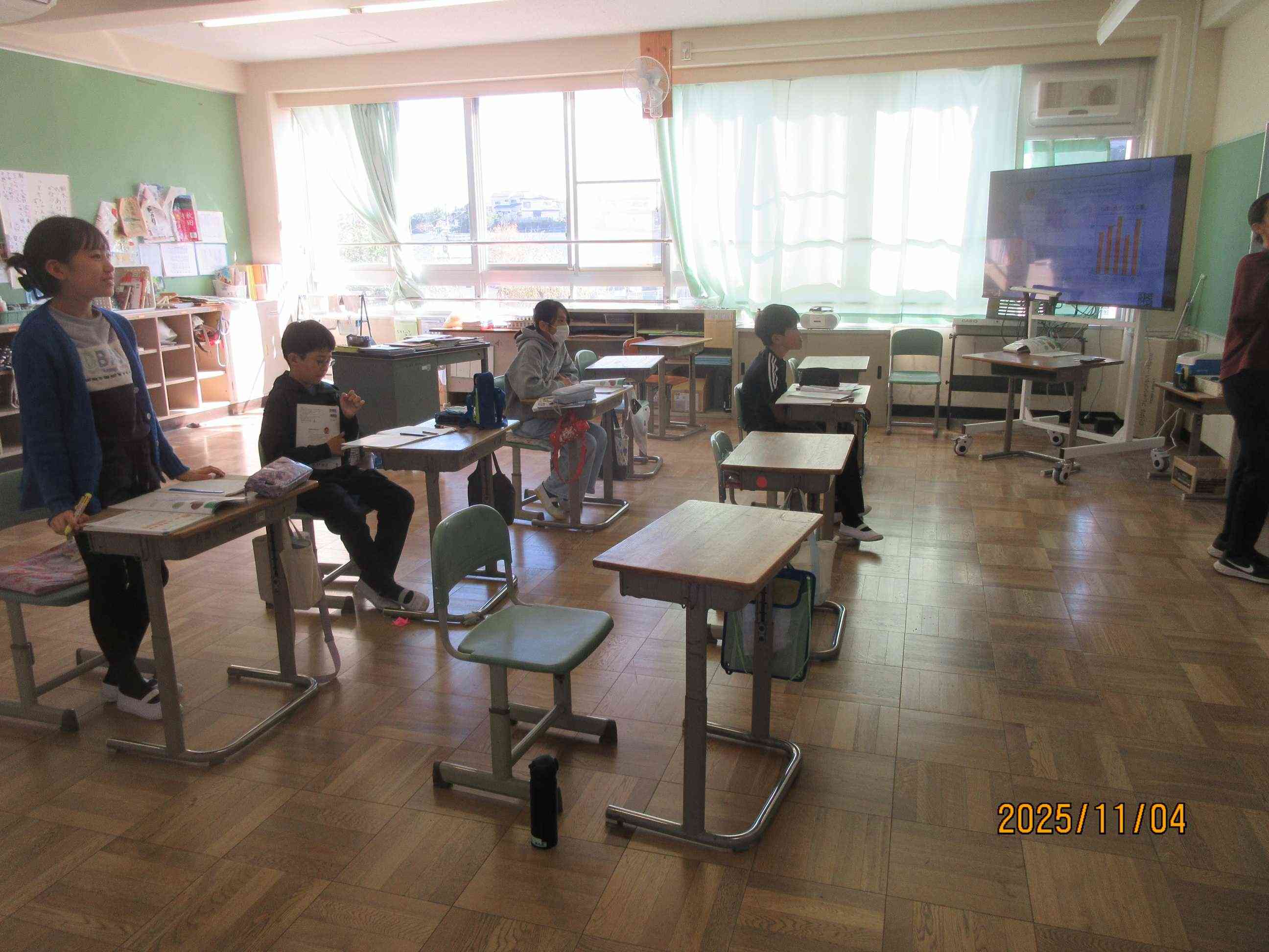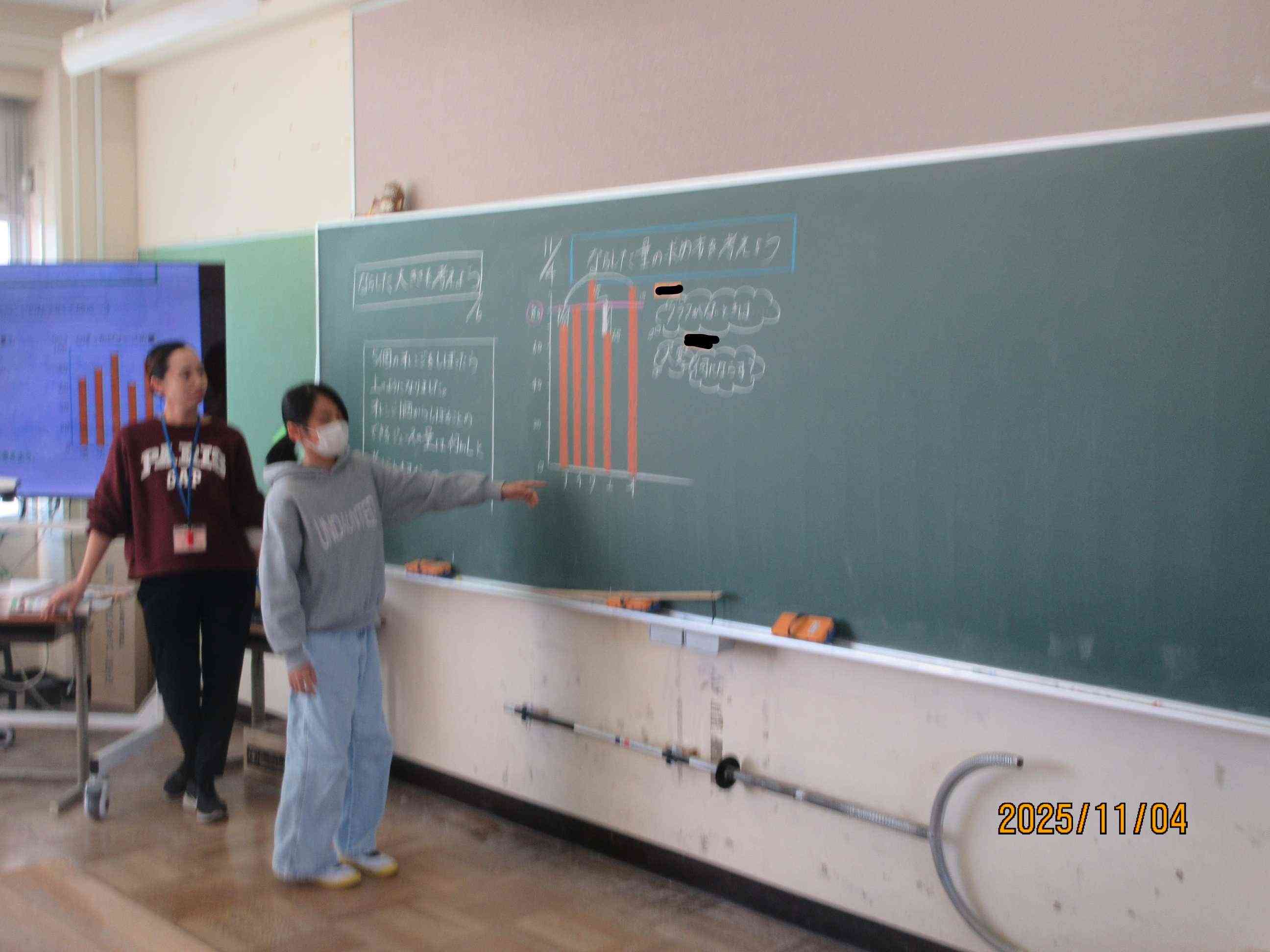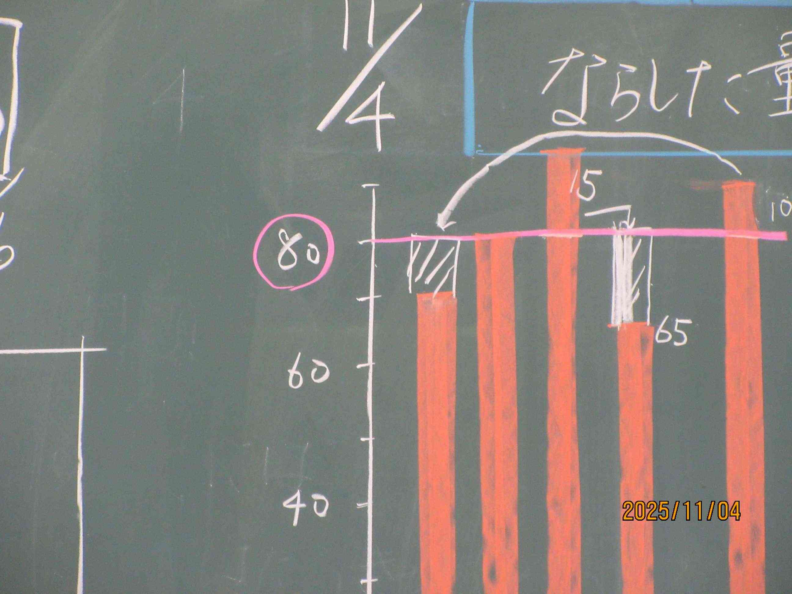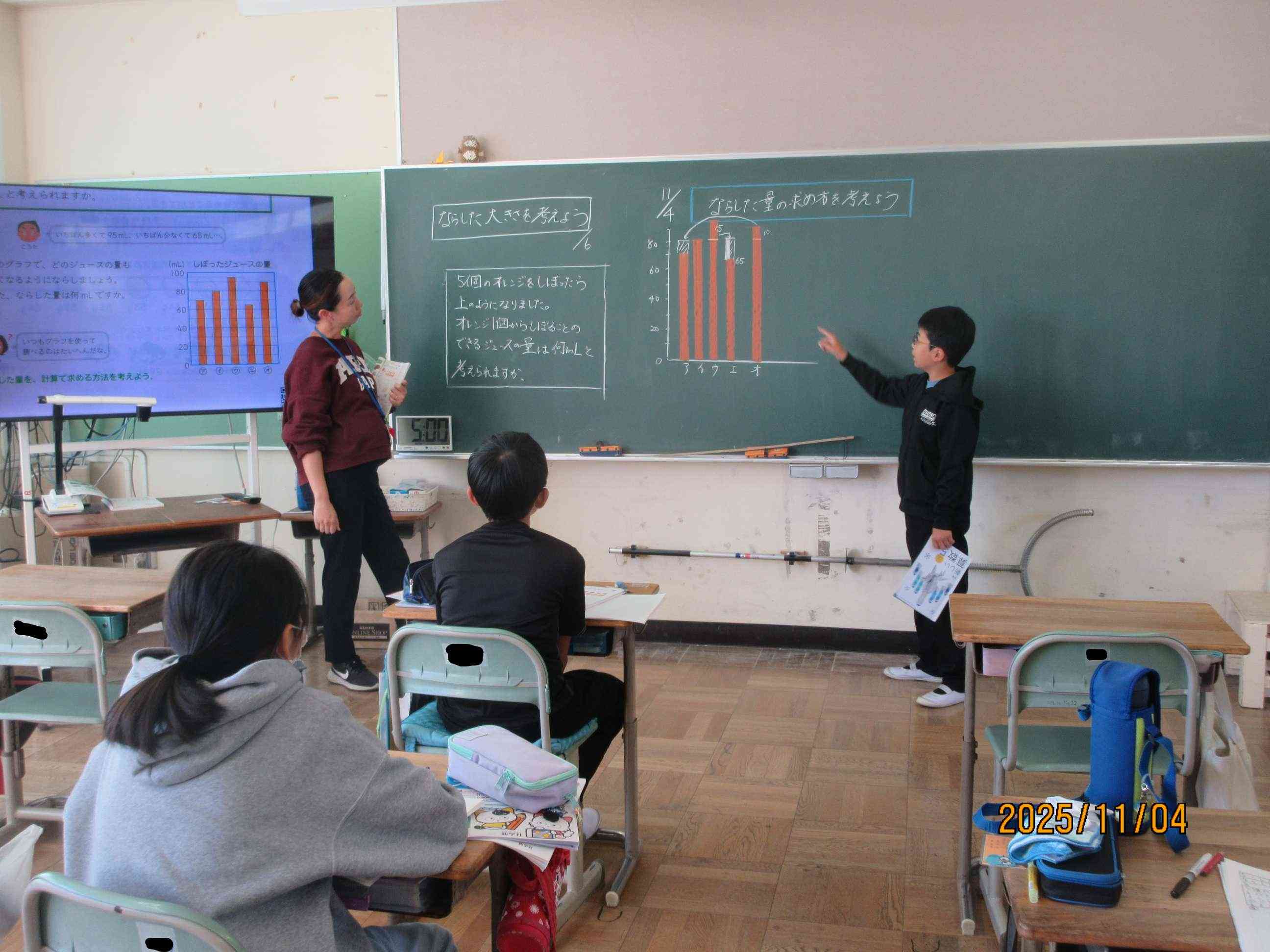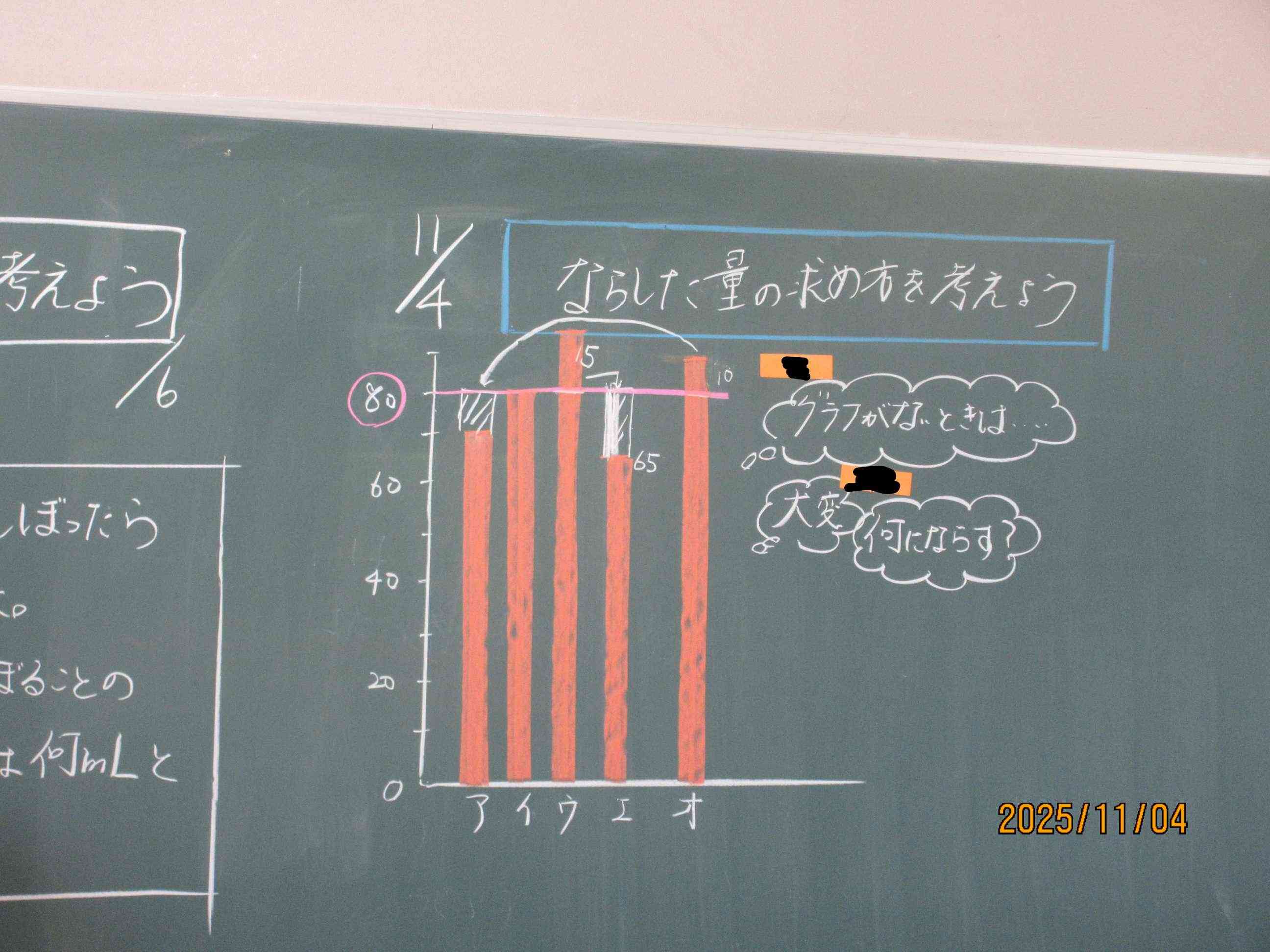 5年生の教室では算数の勉強中です。平均の学習です。いろいろな大きさを等しい大きさにすることを「ならす」といいます。はじめ子ども達は、グラフを使ってそれぞれの大きさをならしていきます。しかし、子ども達は、このやり方がめんどくさい事に気づきます。もっと簡単にできないだろか?と考えました。算数で大切なのは、いろいろな考え方がある中でどれが合理的な考えだろうかと考えること大切なのです。