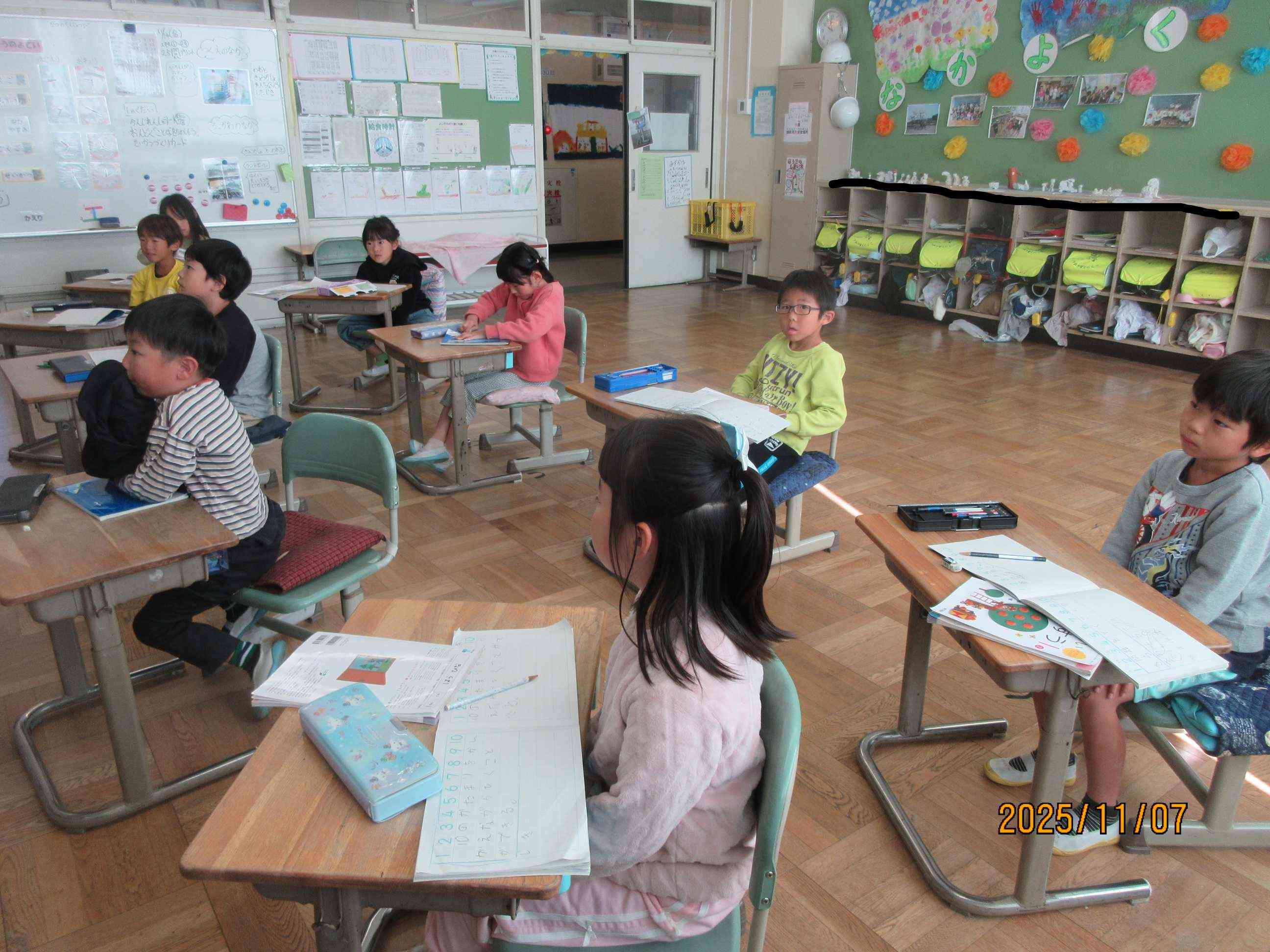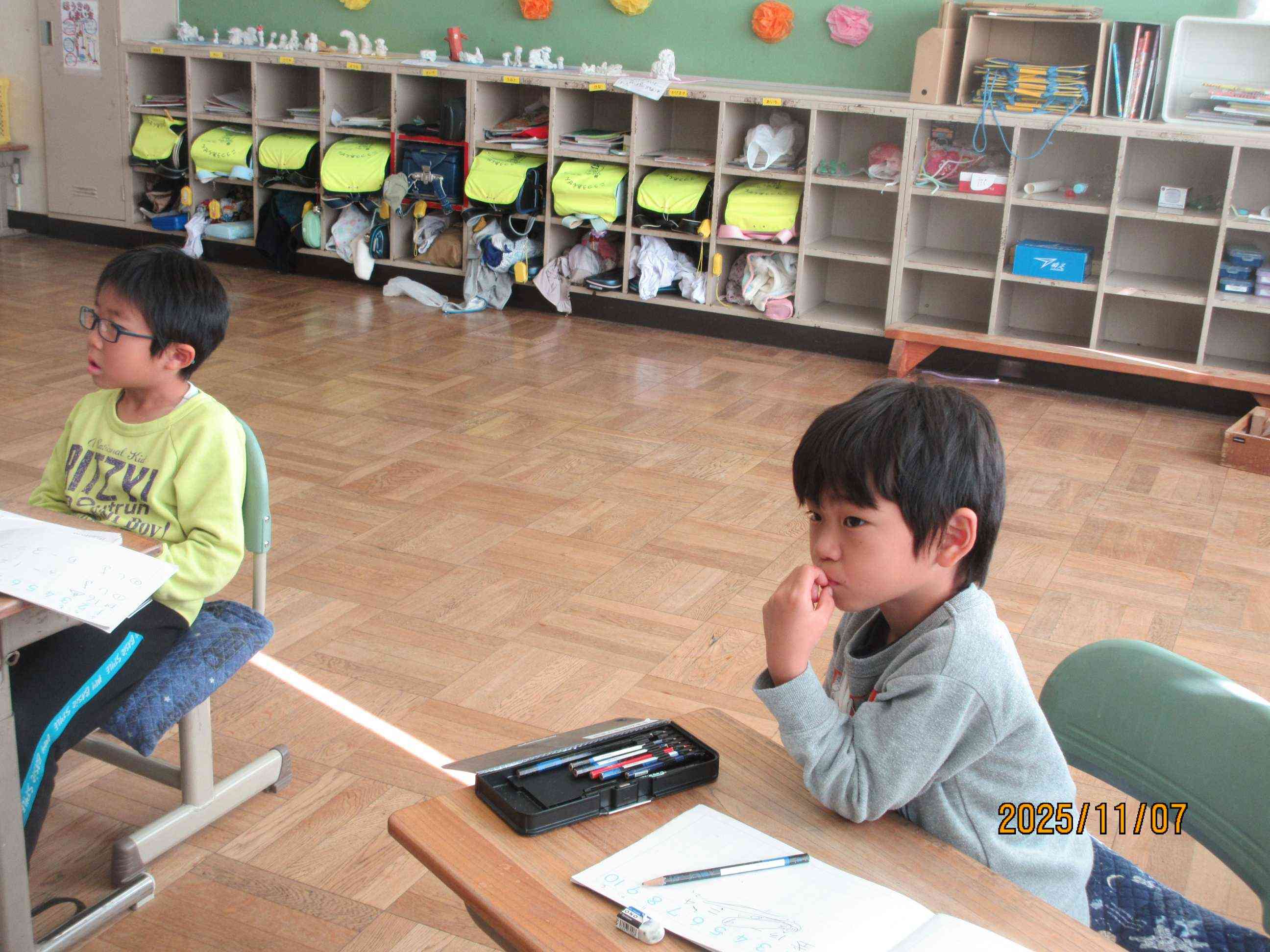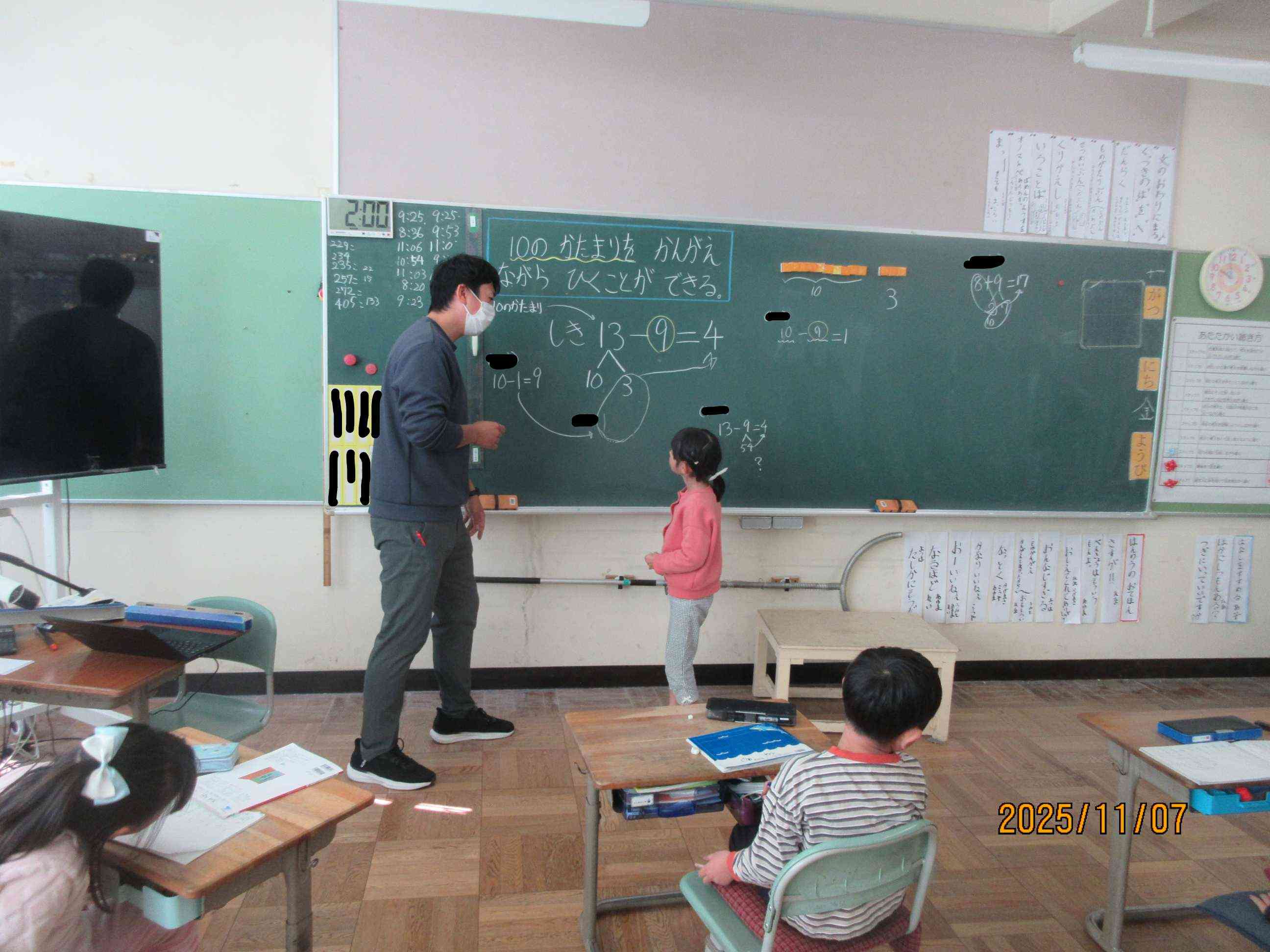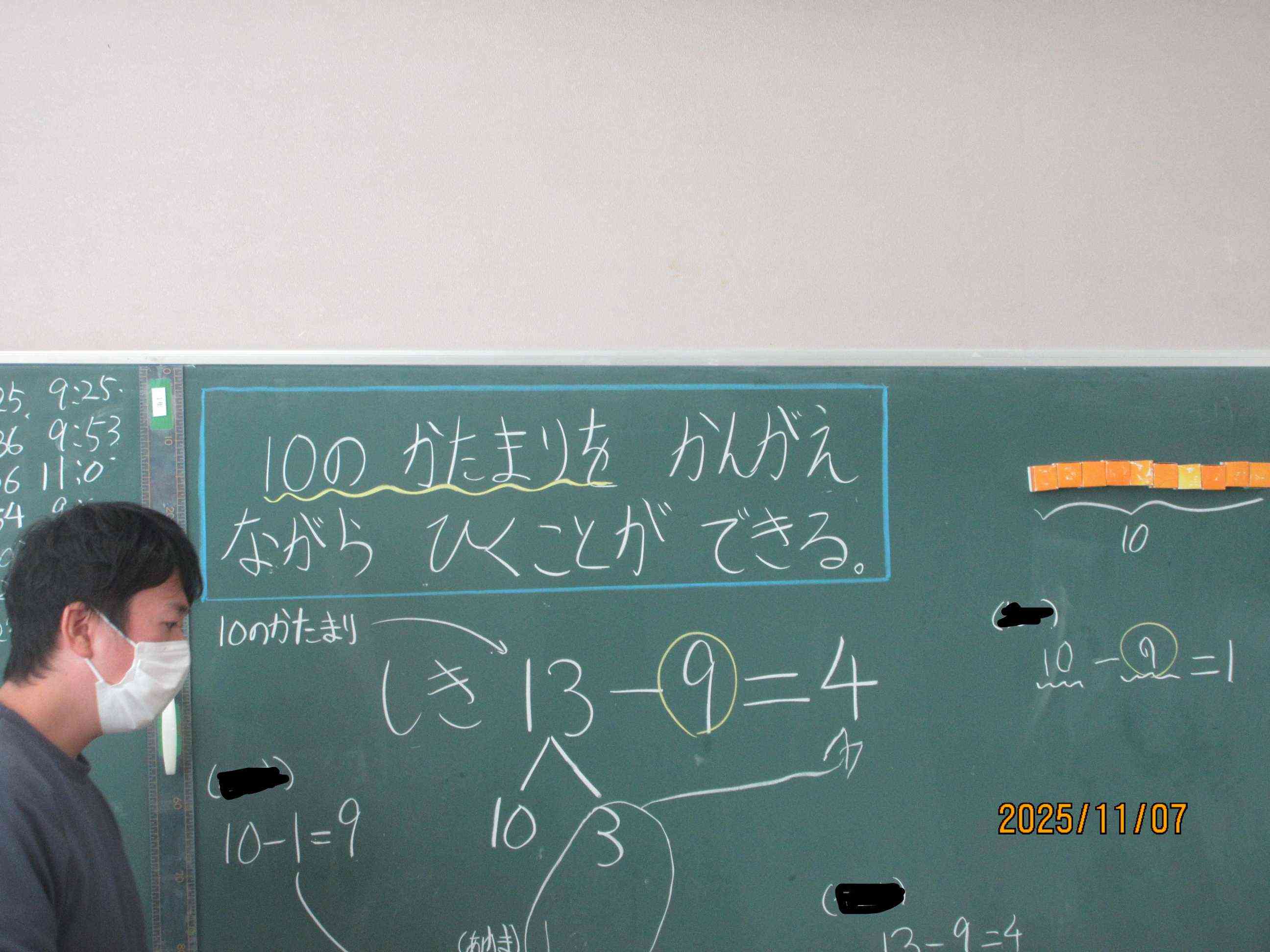 1年生の教室を覗くと算数の学習中!今日の授業のめあては、10のかたまりを意識して引き算をすることみたいです。それぞれ、自分の考えを発表中。友達の考えや自分の考えを比較したりして熟考しているみたいです。