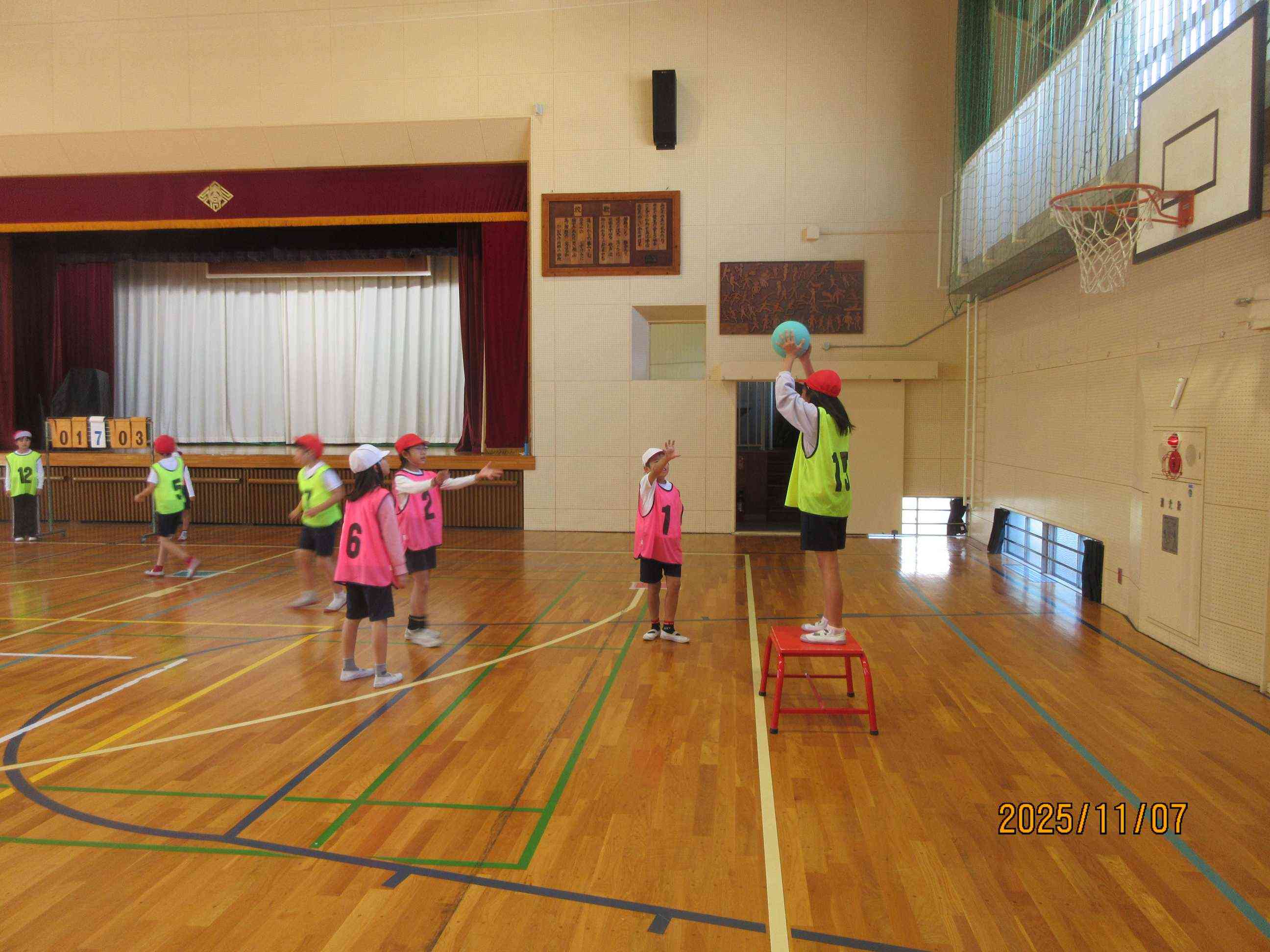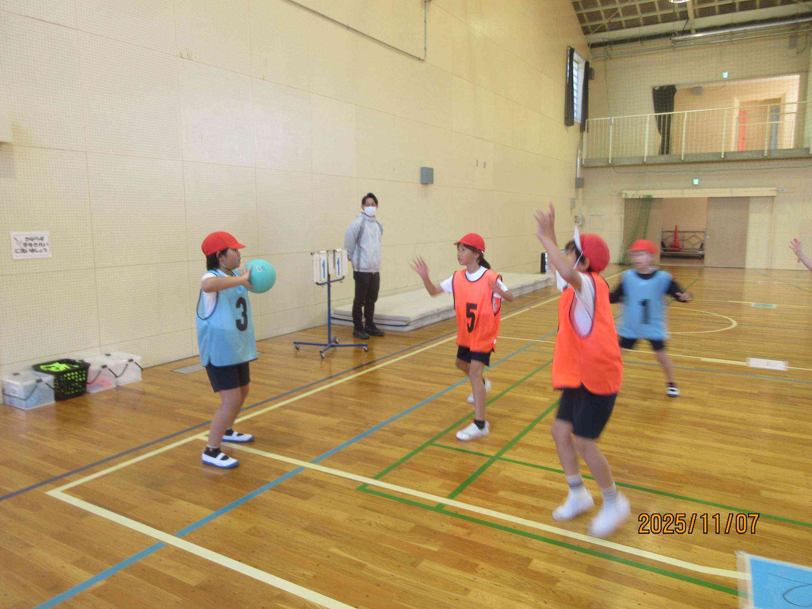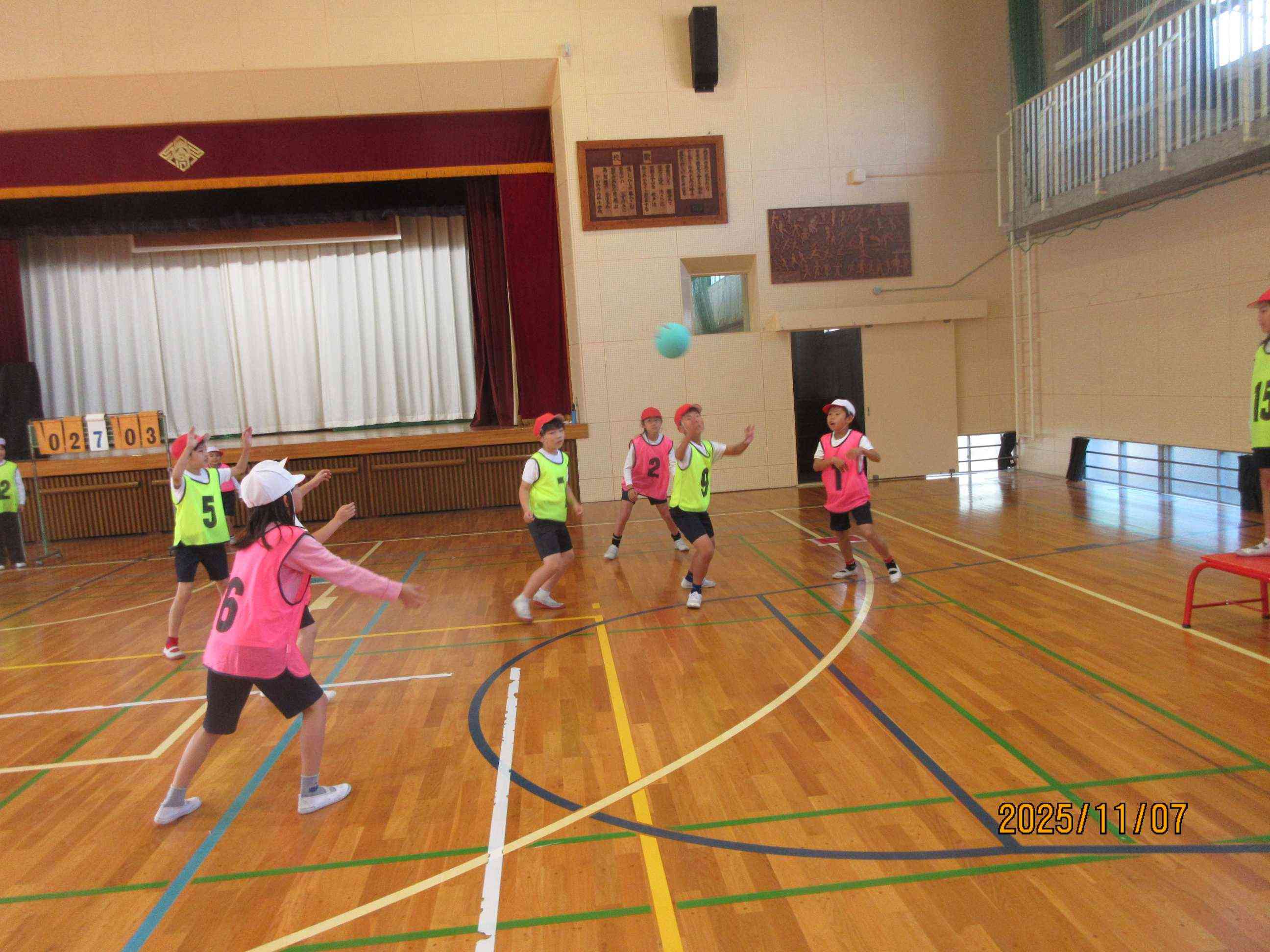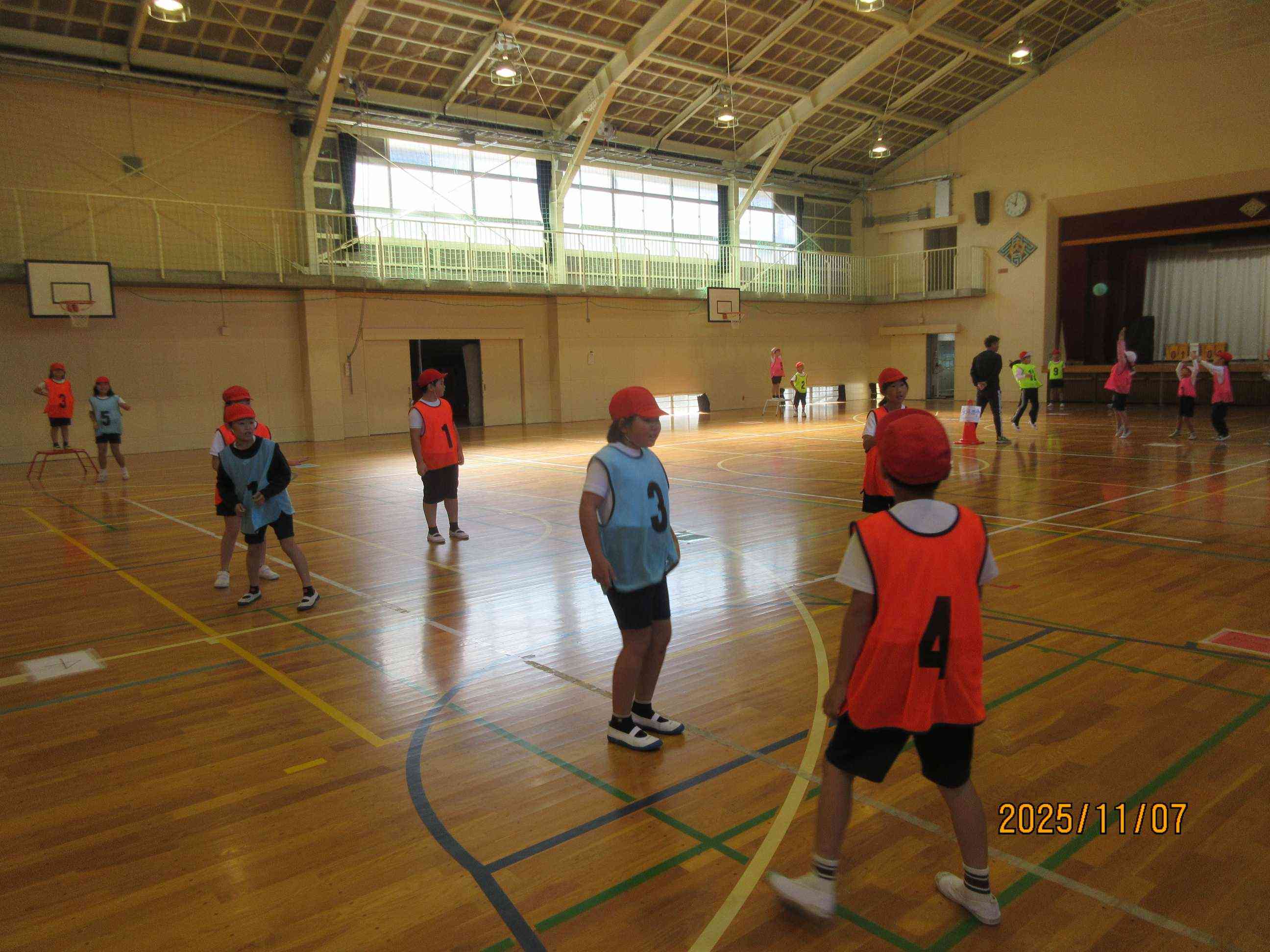 体育館では、3・4年生が合同で体育の学習中。ボール競技で、ポートボールをやっているみたいです。ドリブルができないので、いかにボールを持たない時に動くか、スペースを探すことも重要です。そして、チームワークが必要になってきます。ハーフタイムでは、みんなで作戦会議!活発な議論がなされていました。